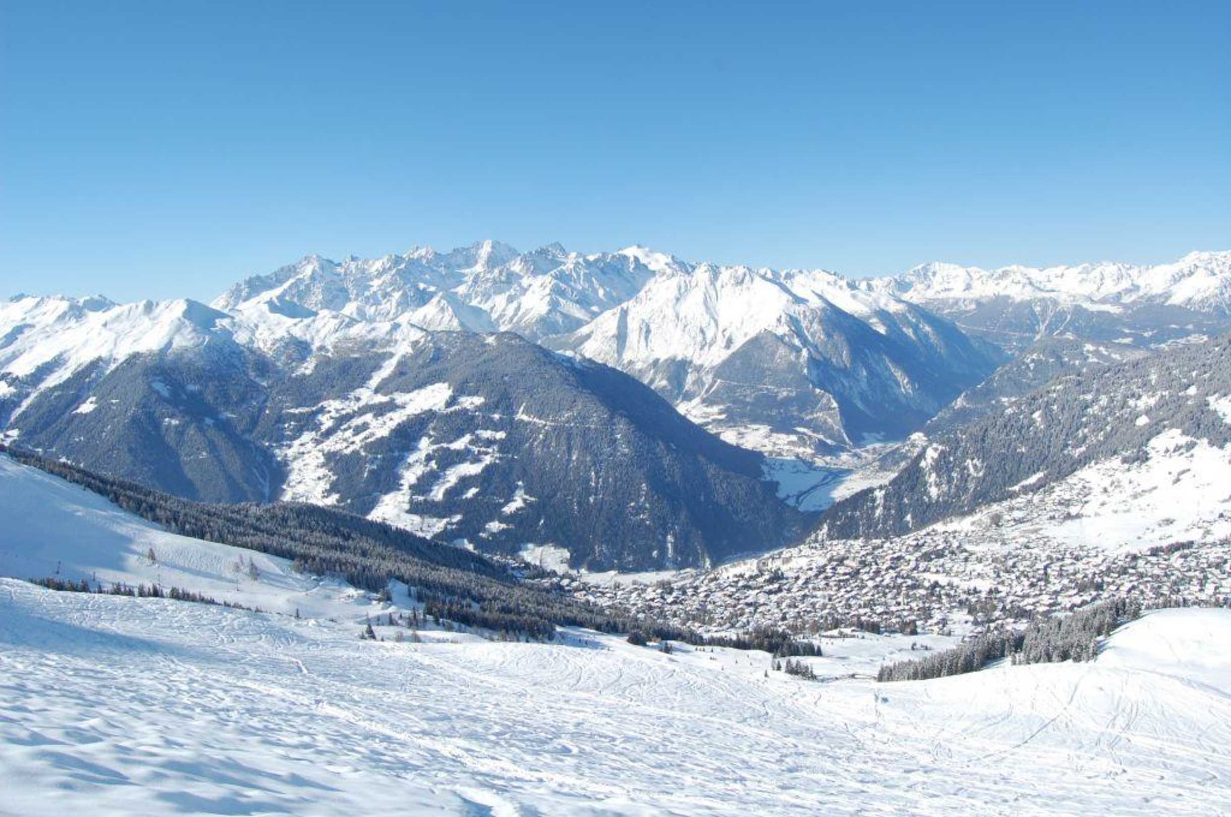 Verbier im Tal und der Montblanc im Hintergrund