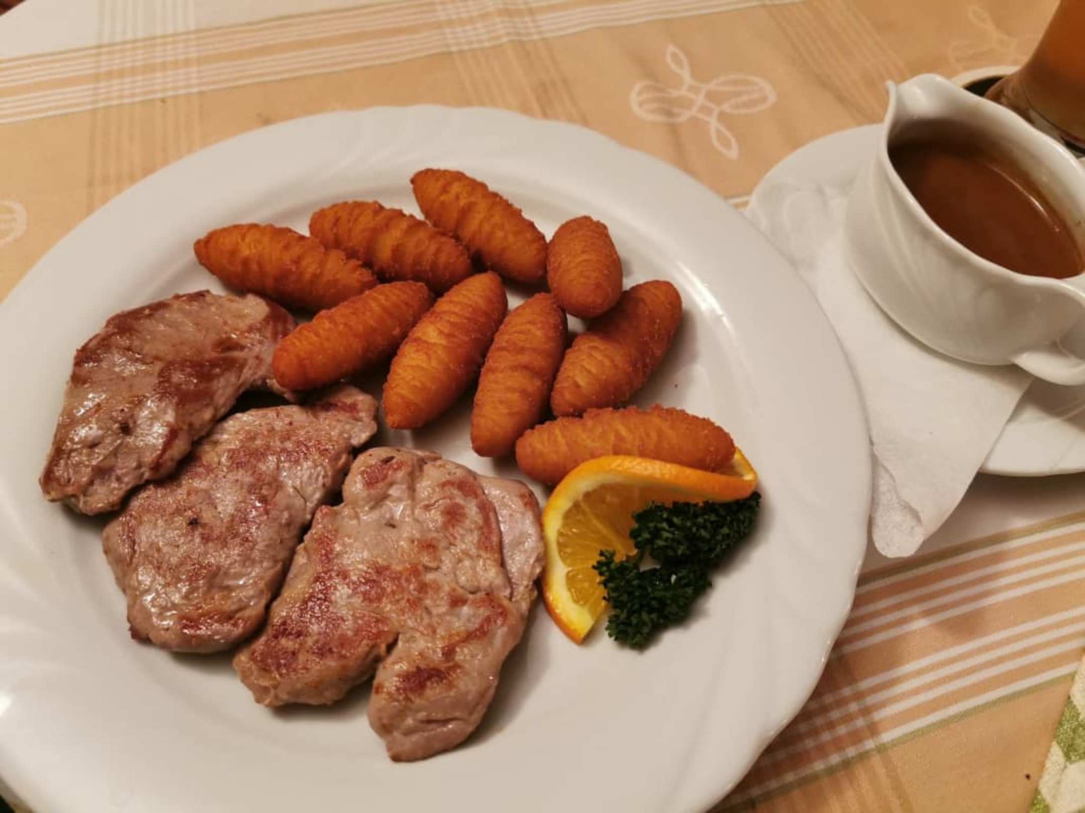 Gegrillte Lendchen mit Rahmsosse und Kroketten