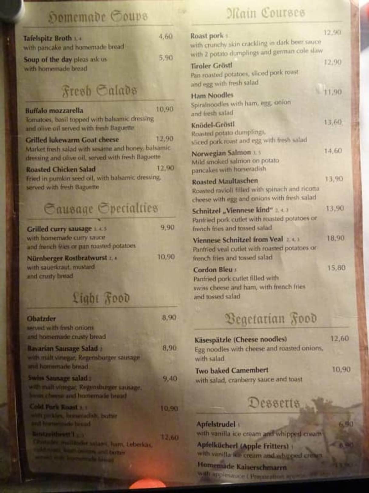 Speisekarte Englisch