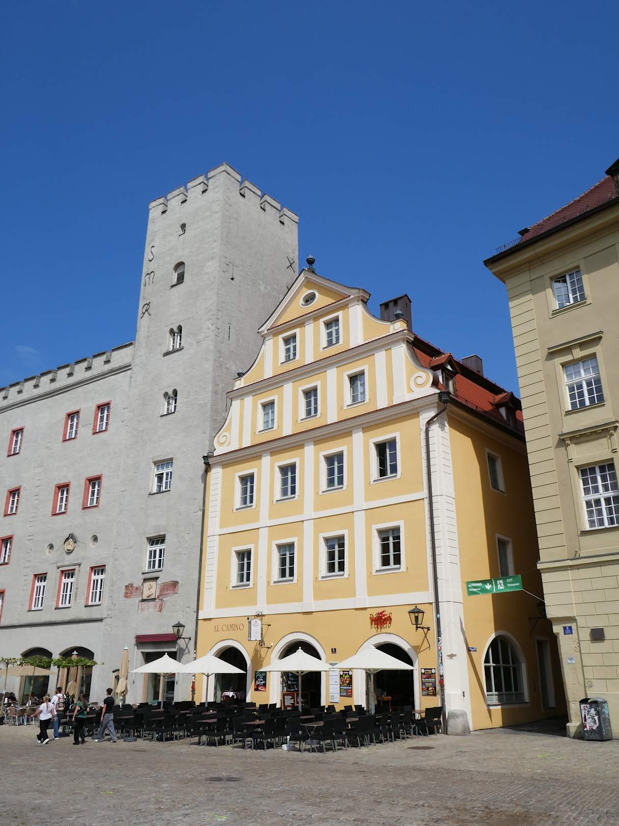 Links das Hotel Goldenes Kreuz mit dem Turm