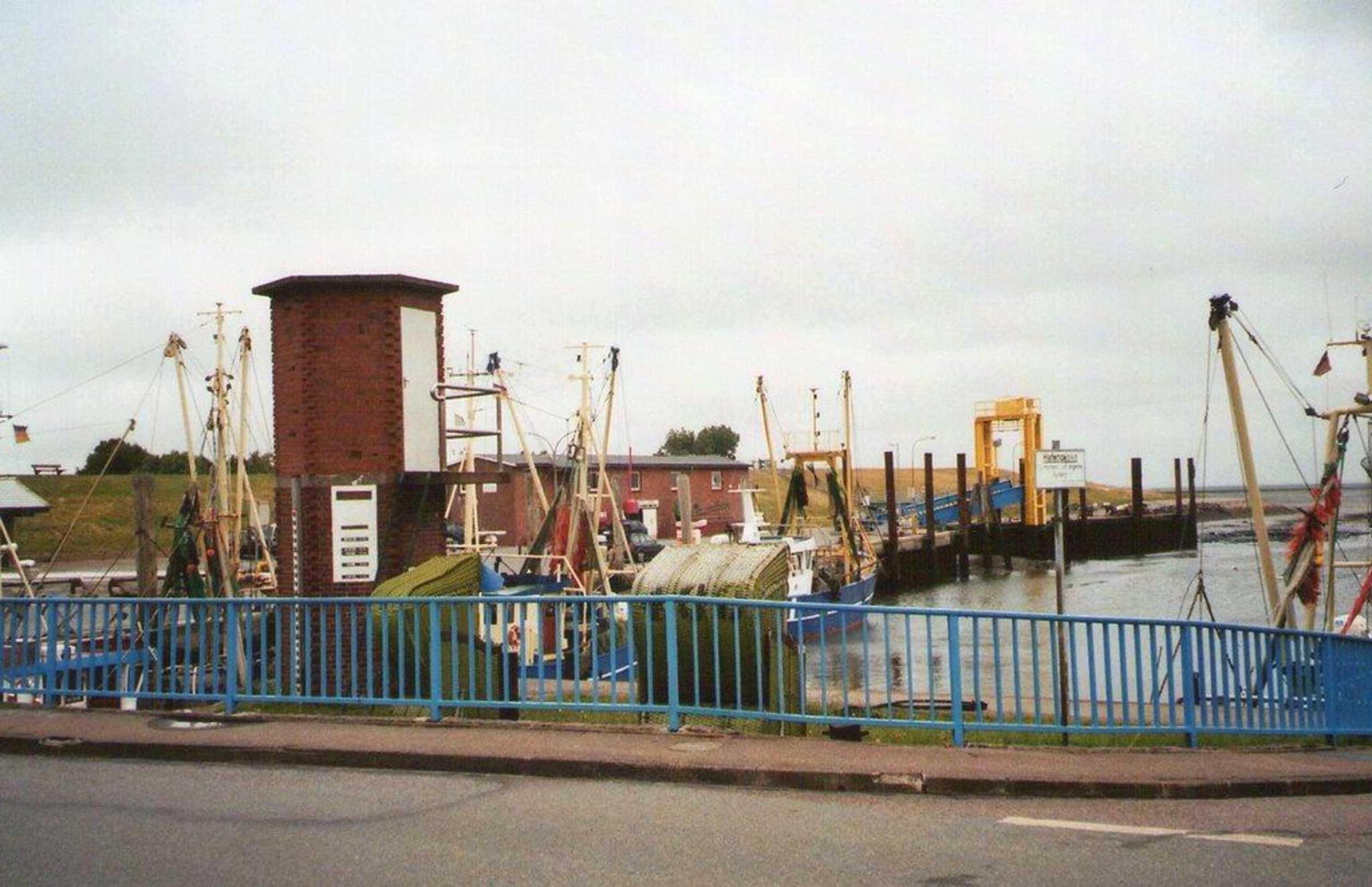 Alter Hafen Tammensiel mit Sturmflutmarken an Turm