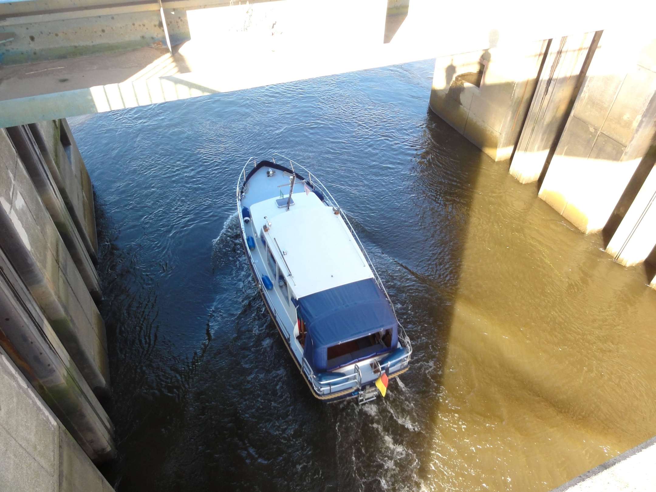 Sportboot in der Schleuse des Sperrwerkes