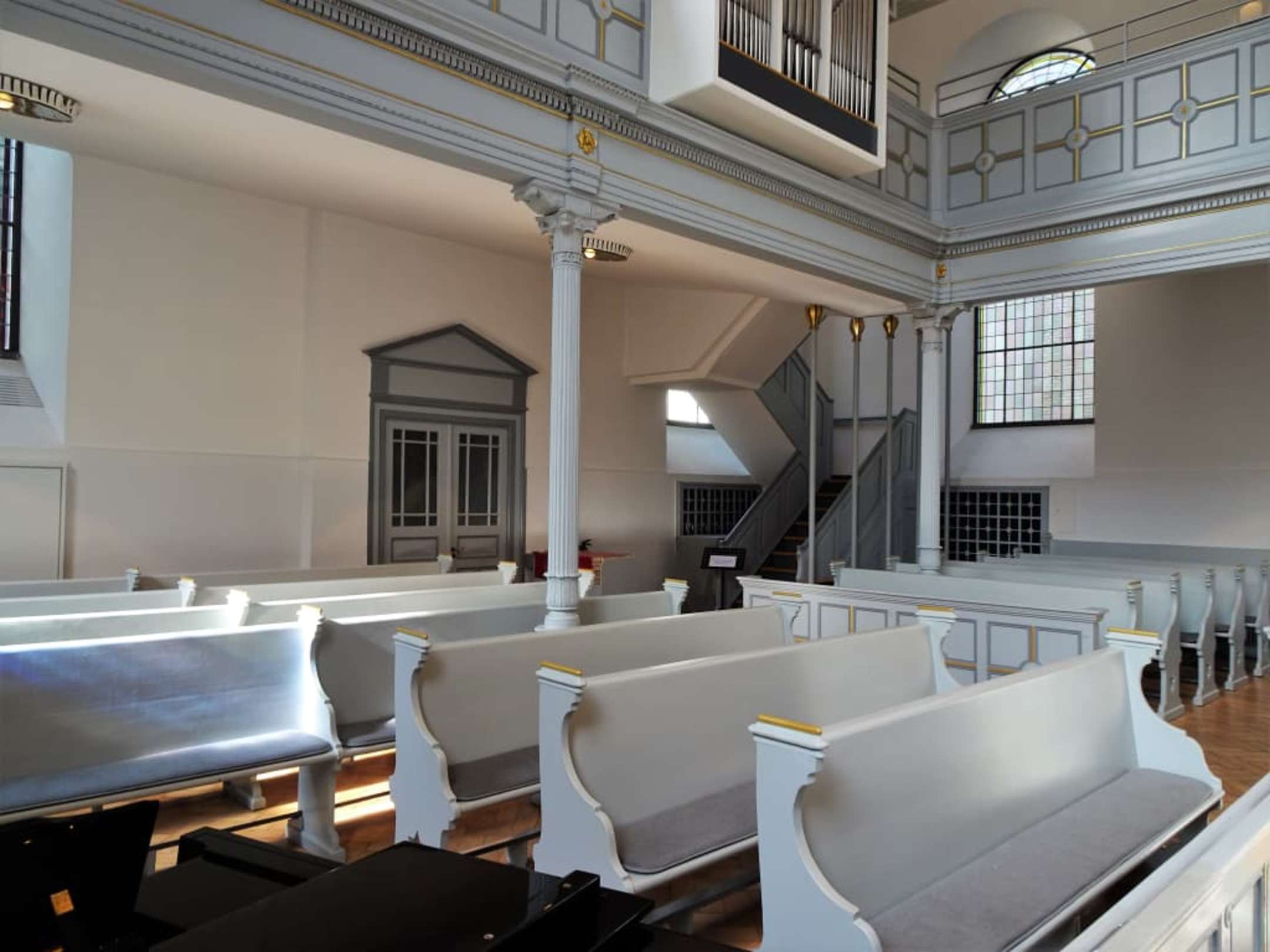 Sitzbänke unter der Orgel in der Neanderkirche
