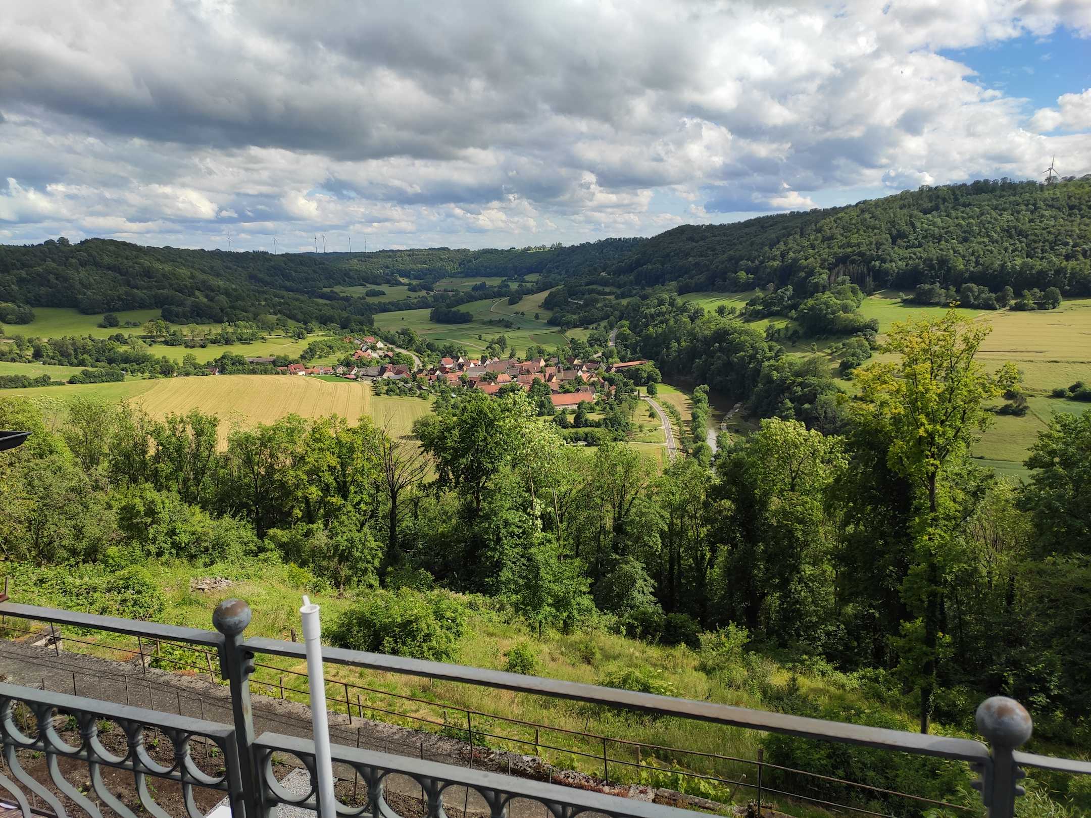 Blick vom Schloßcafe ins Jagsttal mit Bächlingen