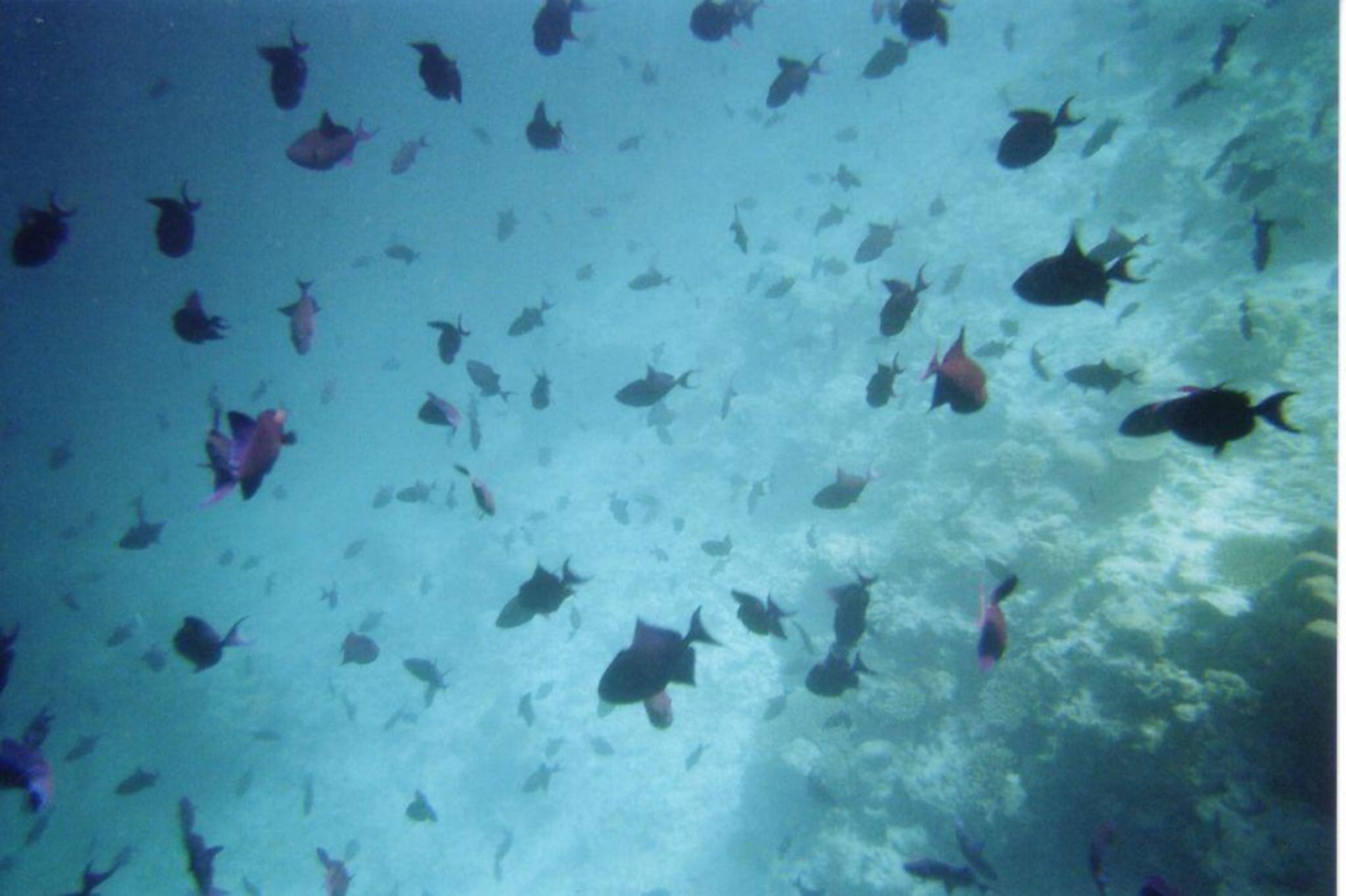 Schwarm Rotzahndrückerfische an der Riffkante