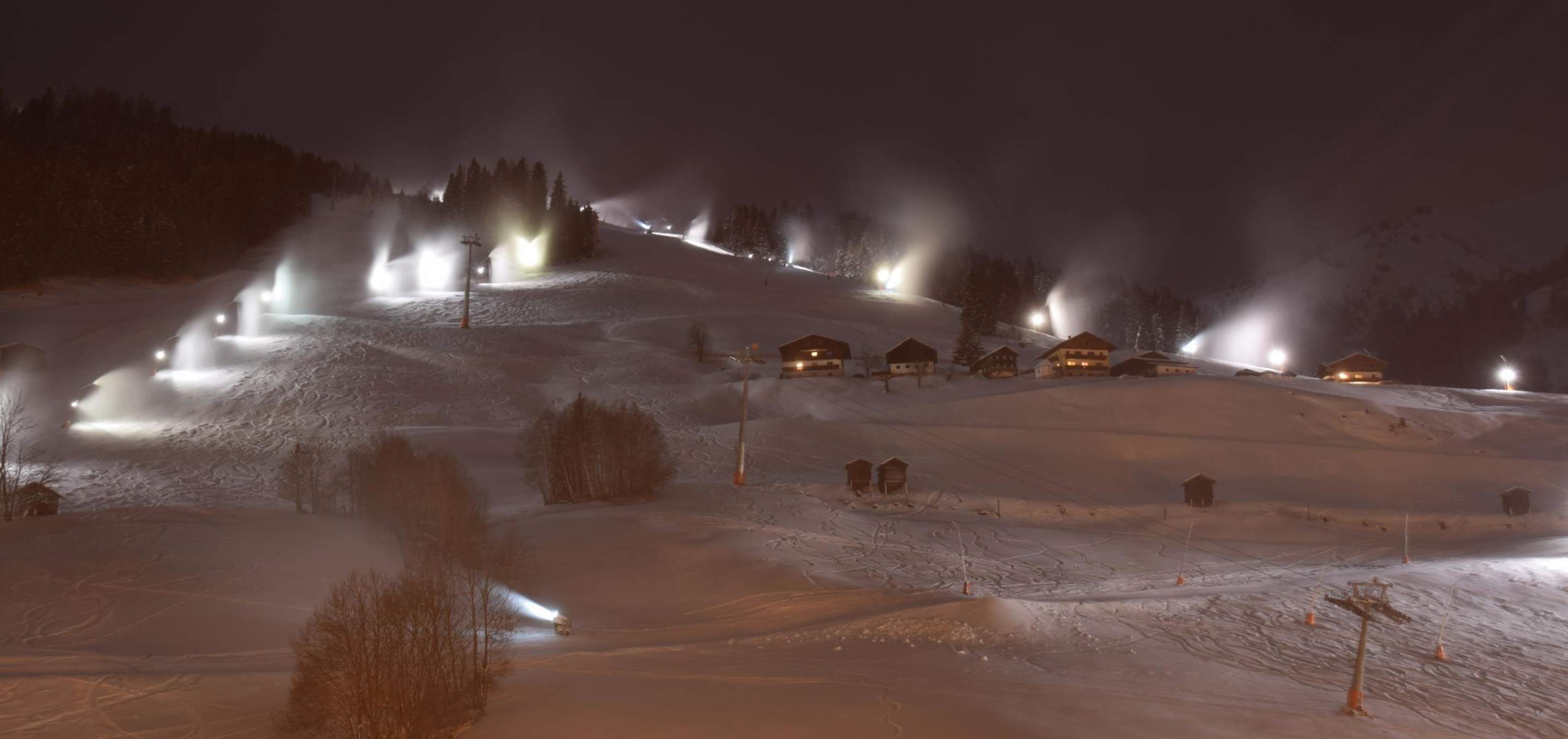 Skipisten bei Nacht.