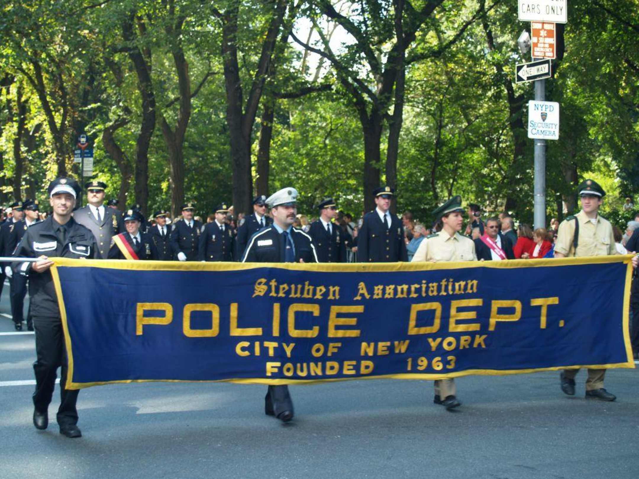 Deutsche Polizeibeamte tragen das NYPD Banner