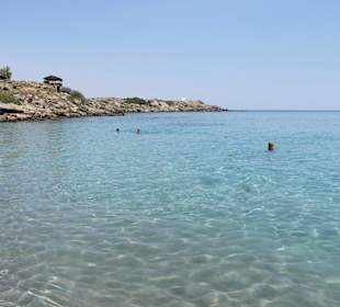 Feiner Sandstrand, keine Steine, kristallklars Wasser, flach abfallend, nicht überlaufen und auch im Hochsommer relativ ruhig und tolle Schnorchelmöglichkeiten. Ideale Bedingungen für die ganze Familie!!! Am linken Ende der Bucht, bei den Felsen, kann man ganz hervorragend schnorcheln. Viele verschiedene farbenfrohe Fischschwärme, und man muss nicht einmal weit raus schwimmen. Auch für jüngere Kinder in geeignet. Ansonsten gibt es einen guten Strandimbiss mit Toiletten, Parkplätze kostenlos (am Kastell) und Liegen mit Schirm zu mieten. Unsere Meinung: Absolut empfehlenswert!!! Wir sind aus dem Norden von Georgioupolis angereist und können nur sagen, der Weg hat sich gelohnt. Und wäre unser Urlaub noch nicht zu Ende gewesen, wären wir auf jeden Fall noch einmal gekommen.